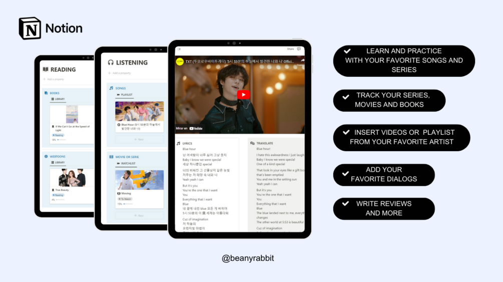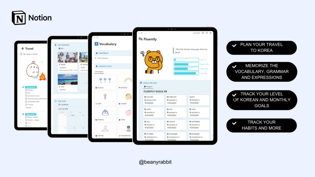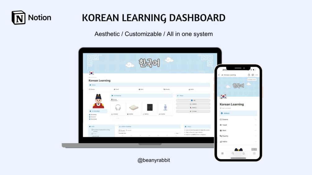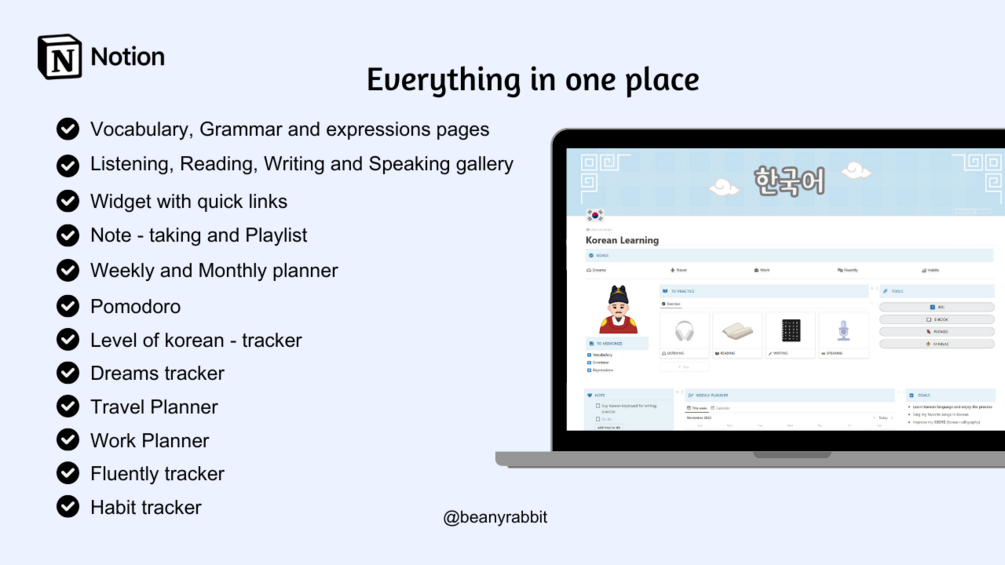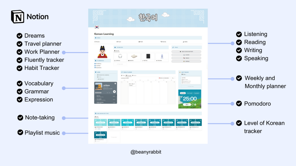 This template is designed to help you plan your day learning korean, keep your notes organized, track your Korean language level and much more.